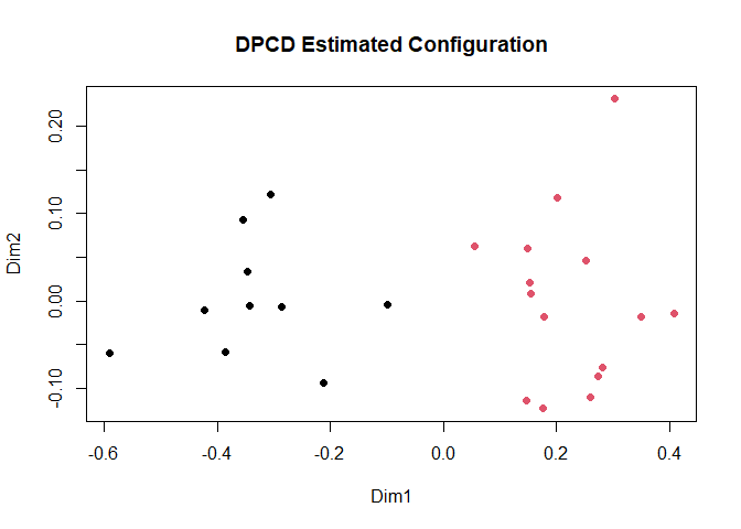 The DPCD package implements a Bayesian hierarchical model for clustering dissimilarity data. The two main objectives of DPCD are to 1. Find a configuration of the objects such that the distance between them approximate the input dissimilarities, accounting for measurement error, and 2. Obtain a meaningful clustering structure for the objects.