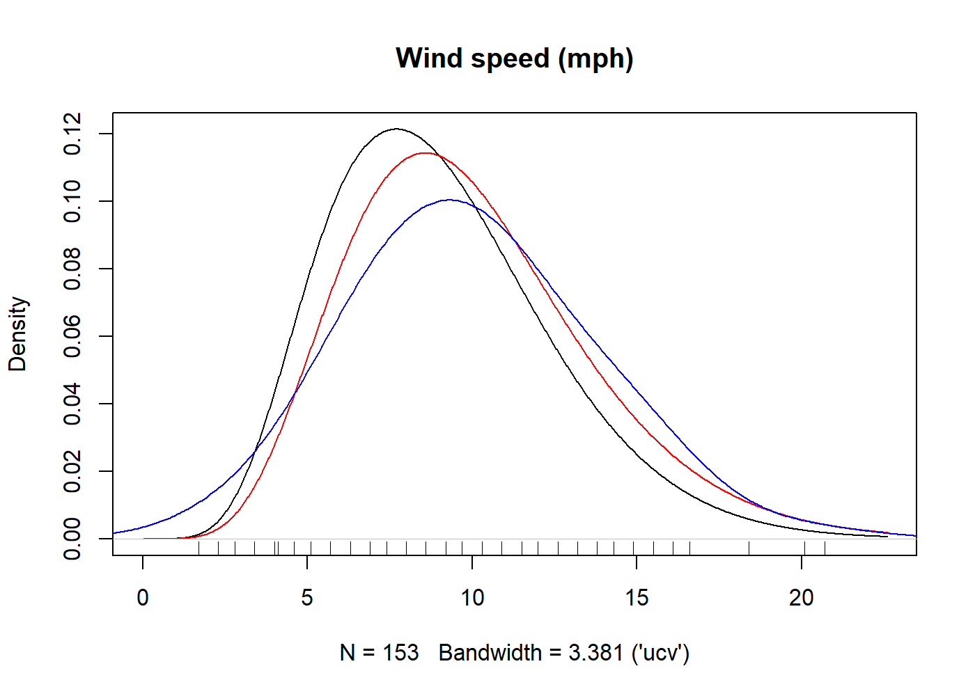 lines(density(airquality$Wind, adjust = 2), col = "blue")