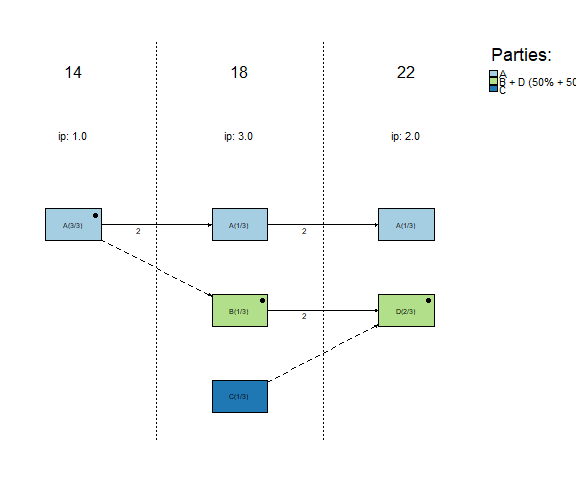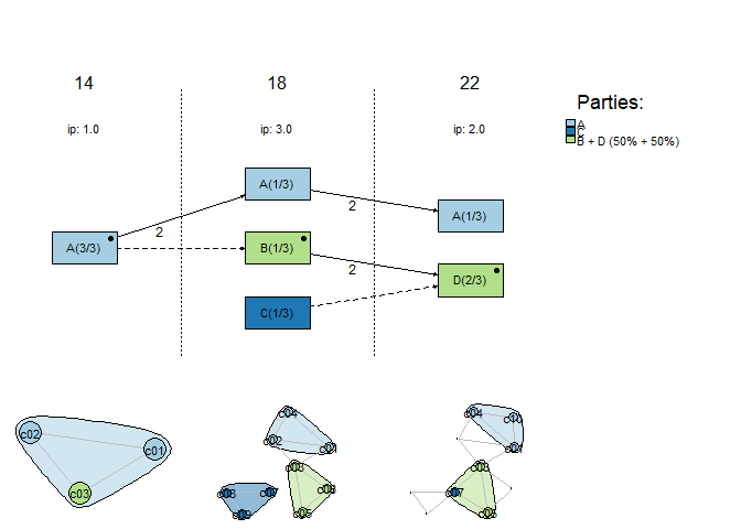 Adding the show_candidate_networks argument extends the continuity diagram with an additional bottom panel showing candidate-candidate network snapshots for each included election. Nodes are coloured by long-term group affiliation (e.g. detected “parties”), while node borders indicate the candidate lists used in each election. This makes it possible to inspect how electoral groupings are composed, how cohesive they are internally, and how they may fragment, merge, or realign over time.