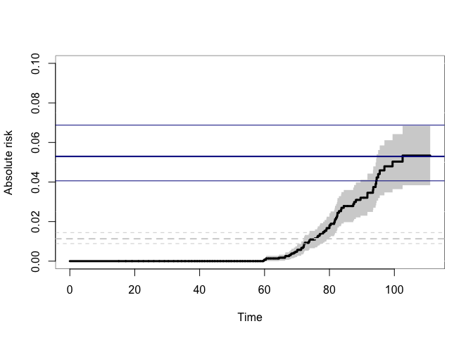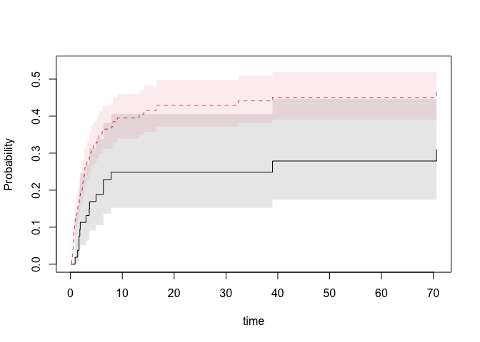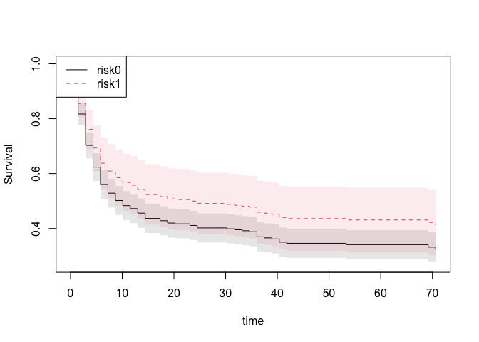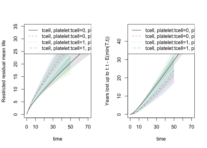 #> [6,] -0.001404170 0.0009471848or the the restricted mean survival or years-lost to cause 1